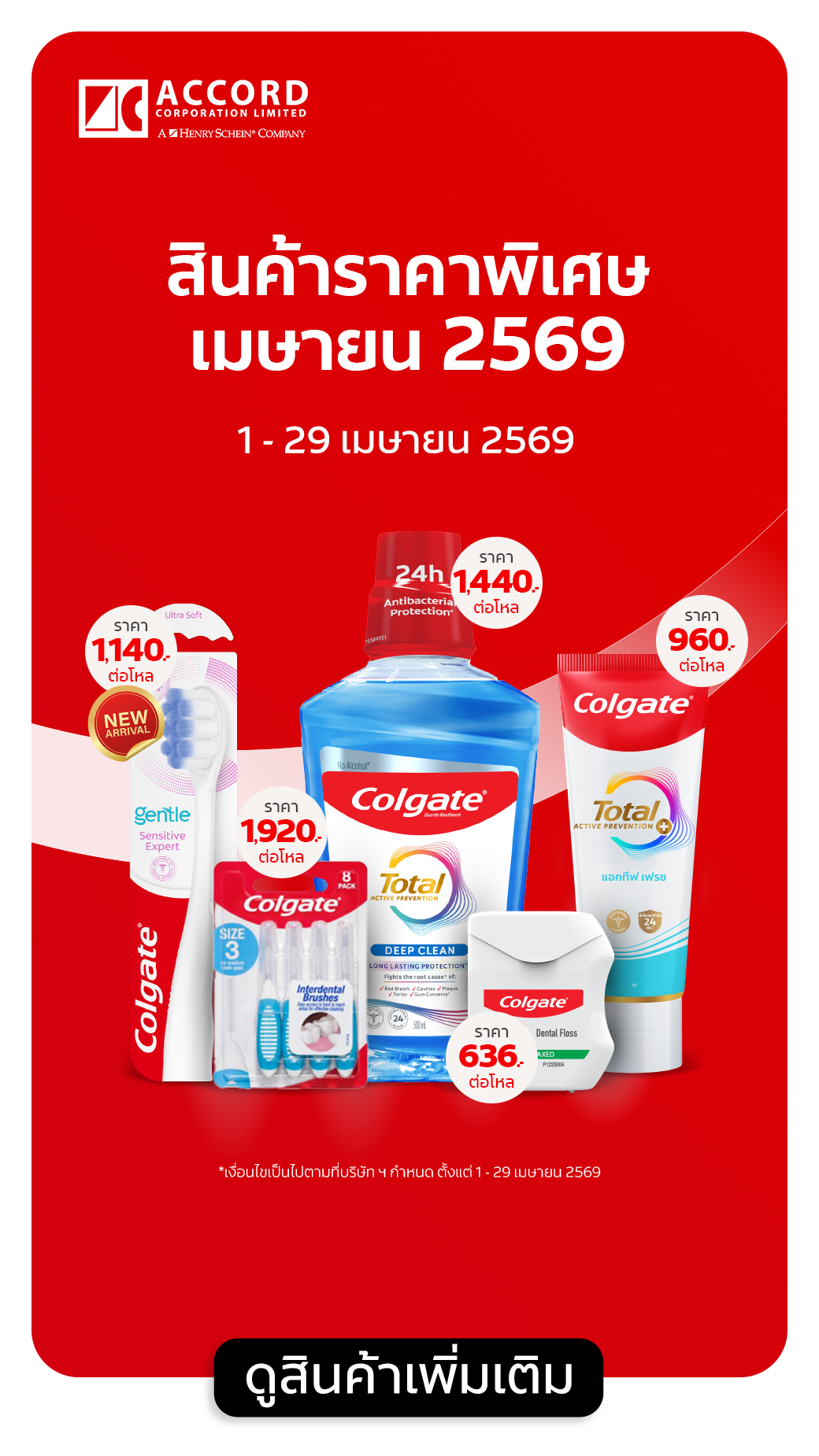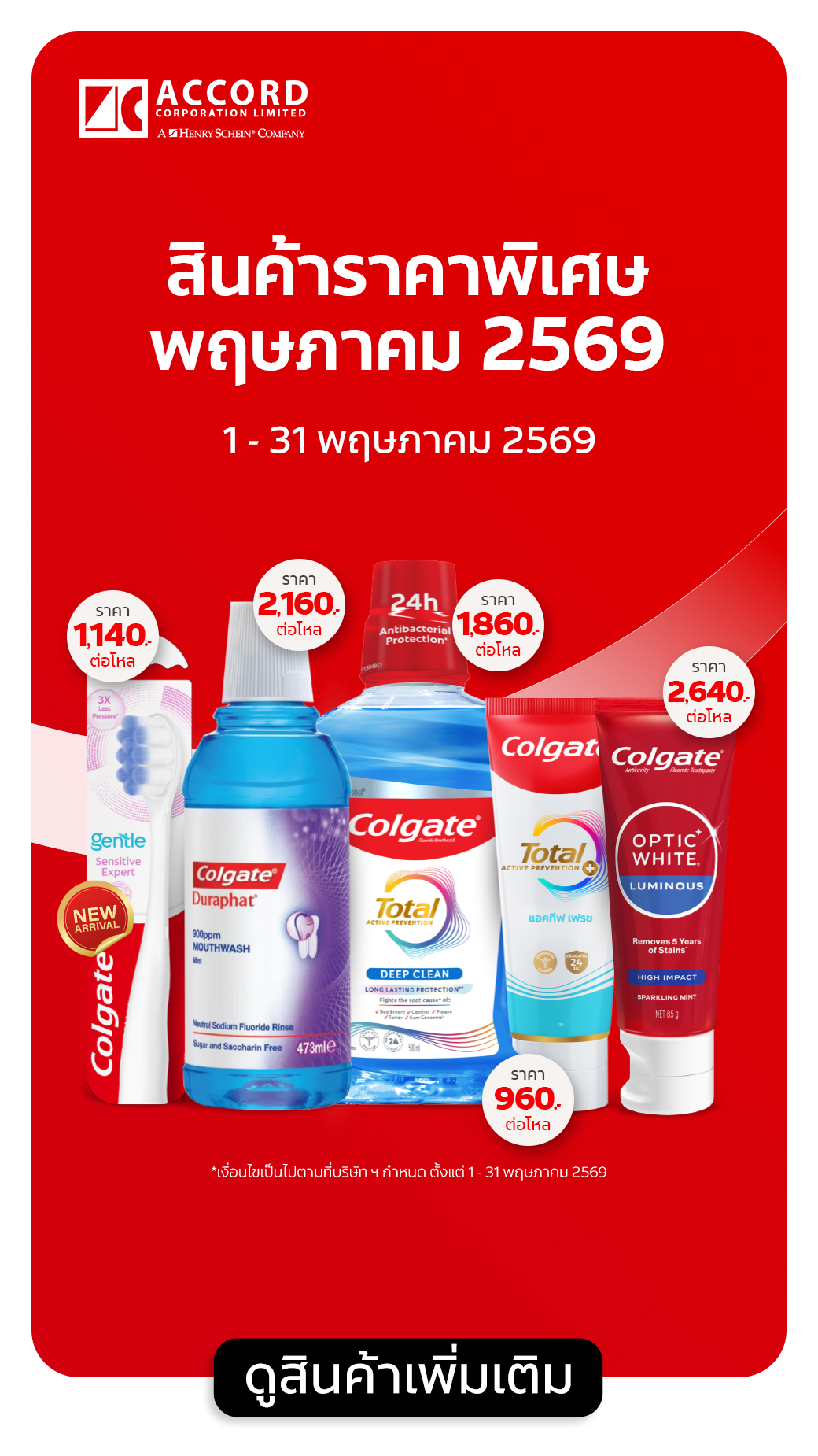 PRODUCT CATALOG FLUORIDE THERAPY & DENTAL DEVICE TOOTHPASTE TOOTHBRUSH MOUTHWASH KIDS FLUORIDE THERAPY & DENTAL DEVICE อ่านเพิ่ม Close Duraphat Varnish 10 ml. (860.-) อ่านเพิ่ม Close Duraphat Mouthwash 473 ml. (180.-) อ่านเพิ่ม Close Ortho Defense Phos Flur Rinse 500 ml. (155.-) อ่านเพิ่ม Close Interdental Brush size 0 (160.-) อ่านเพิ่ม Close Interdental Brush size 3 (160.-) อ่านเพิ่ม Close Colgate Blast Water Flosser Teal (2,000.-) อ่านเพิ่ม Close Colgate Blast Water Flosser White (2,000.-) อ่านเพิ่ม Close Colgate Optic White Powered Toothbrush (415.-) อ่านเพิ่ม Close OPTIC WHITE HIGH IMPACT 2%HP ขนาด 85กรัม (220.-) TOOTHPASTE อ่านเพิ่ม Close Colgate Total Active Fresh 150 g. (80.-) อ่านเพิ่ม Close Colgate Total Sensitivity+Gum Health 150 g. (80.-) อ่านเพิ่ม Close Sensitive Pro-Relief Complete Protection 110g 1+1 (150.-) อ่านเพิ่ม Close Total Plaque Release 95 g. (90.-) TOOTHBRUSH อ่านเพิ่ม Close Colgate Dental Floss (53.-) อ่านเพิ่ม Close Colgate Gentle Gum Care (45.-) อ่านเพิ่ม Close Colgate Gentle Gum Expert (95.-) อ่านเพิ่ม Close Colgate Gentle Sensitive Expert (95.-) อ่านเพิ่ม Close Colgate Oral Care Travel set (65.-) อ่านเพิ่ม Close Colgate SlimSoft Charcoal (48.-) อ่านเพิ่ม Close Colgate SlimSoft Deep Clean (48.-) อ่านเพิ่ม Close Colgate SlimSoft Ortho (55.-) อ่านเพิ่ม Close Colgate SlimSoft Plaque Release (55.-) อ่านเพิ่ม Close Colgate Total Foaming Clean Toothbrush (95.-) MOUTHWASH อ่านเพิ่ม Close Colgate Plax Herbal Detox 250 ml. 250ml. (50.-) อ่านเพิ่ม Close Colgate Plax Herbal Detox 750 ml. (175.-) อ่านเพิ่ม Close Colgate Plax Peppermint Mouthwash 250ml. (50.-) อ่านเพิ่ม Close Colgate Plax Peppermint Mouthwash 750 ml. (175.-) อ่านเพิ่ม Close Colgate Plax Salt Herbal Mouthwash 250ml. (50.-) อ่านเพิ่ม Close Colgate Plax Salt Herbal Mouthwash 750 ml. (175.-) อ่านเพิ่ม Close Colgate Total Deep Clean Mouthwash 500ml. (120.-) อ่านเพิ่ม Close Colgate Total Gum Care Mouthwash 500ml. (120.-) KIDS อ่านเพิ่ม Close Colgate Gentle Kids Fluffy Paw (55.-) อ่านเพิ่ม Close Colgate Kid Mind Mint Gel TP 40 g. (19.-) อ่านเพิ่ม Close Colgate Smile Barbie / Batman 2-5 yrs (38.-) อ่านเพิ่ม Close Colgate Smile Barbie / Batman 5-9 yrs (38.-) อ่านเพิ่ม Close Colgate Sonic Minion Powered TB (270.-)